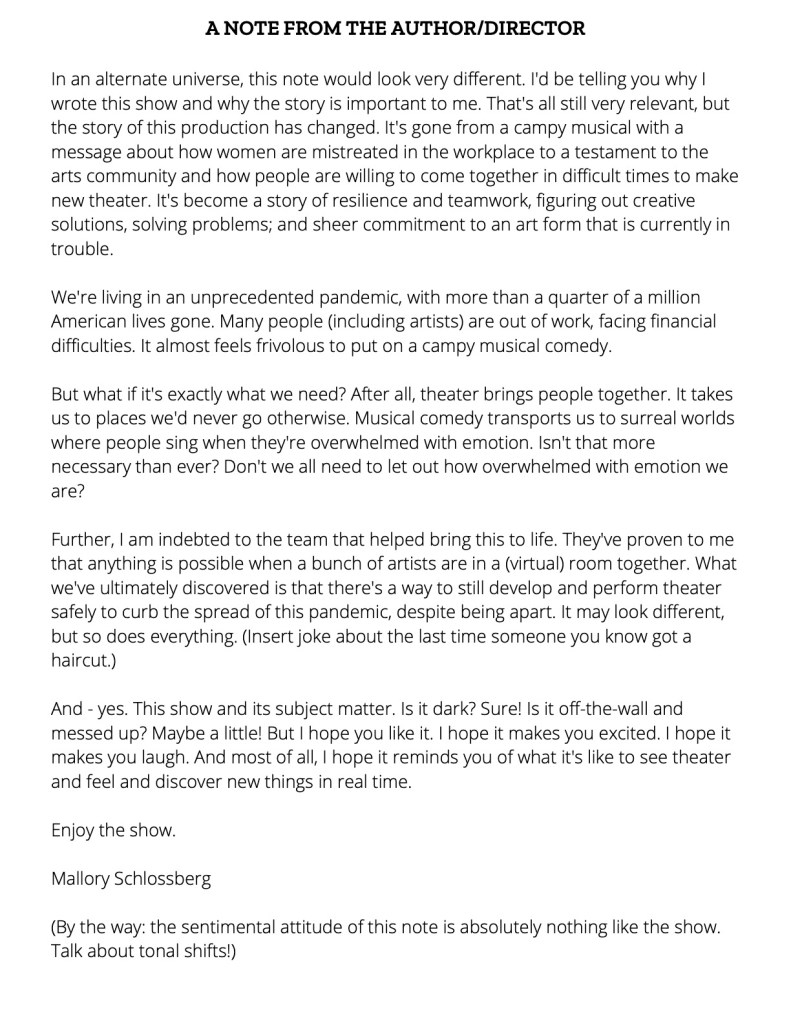 “The BEST part was hearing from people how this show made them feel like they were seeing live theater again. This production – given its virtual nature and the state of the world right now – ended up being a testament to the power of live theatre,” Schlossberg says. “As a writer – and a performer – your job is to give. So knowing that we were able to do that really means the world to me.”