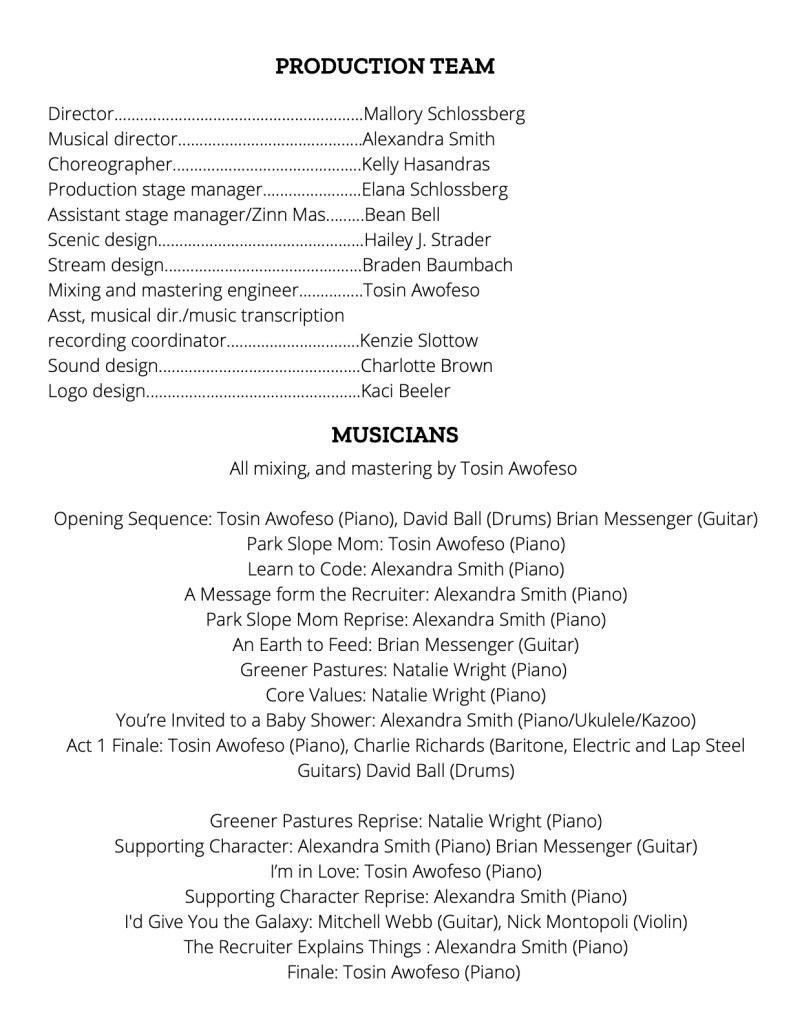 The sharp wit of Human Resources wouldn’t cut as cleanly without the musical direction of Alexandra Smith. “I think doing the music I clocked anywhere from 500-600 hours of writing time over the last 7 months,” she shares. “At the time I joined, I was not expecting this to turn into the project that it did. It was an opportunity to learn something new and exciting, and I truly believed I would never get another shot at doing this. So I took the leap and watched this show come to life.”