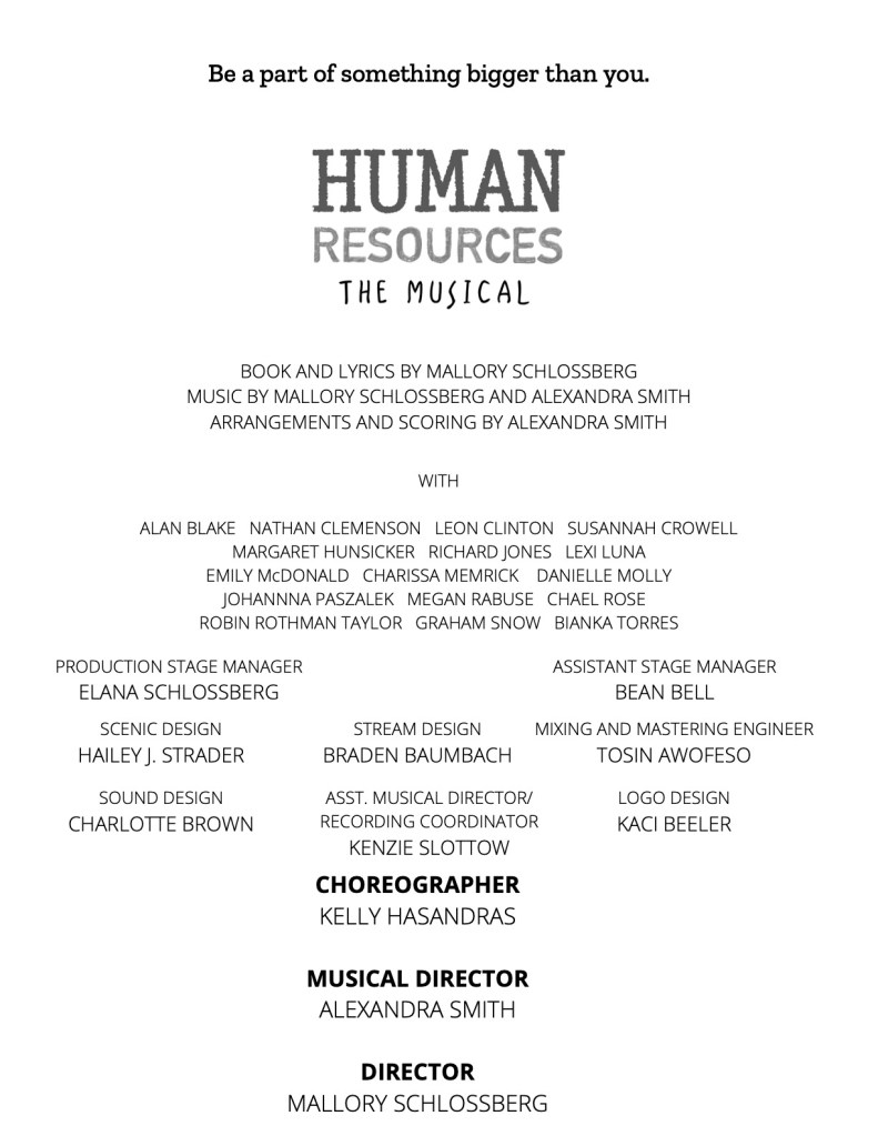 Performances of Human Resources: The Musical run through December 20, 2020. If you want to be a part of something bigger, purchase tickets on their website here.